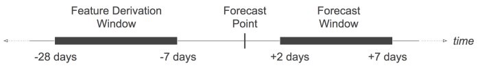 Similarly, we can generate a number of different time series features that can be useful to predict different forecast distances :
